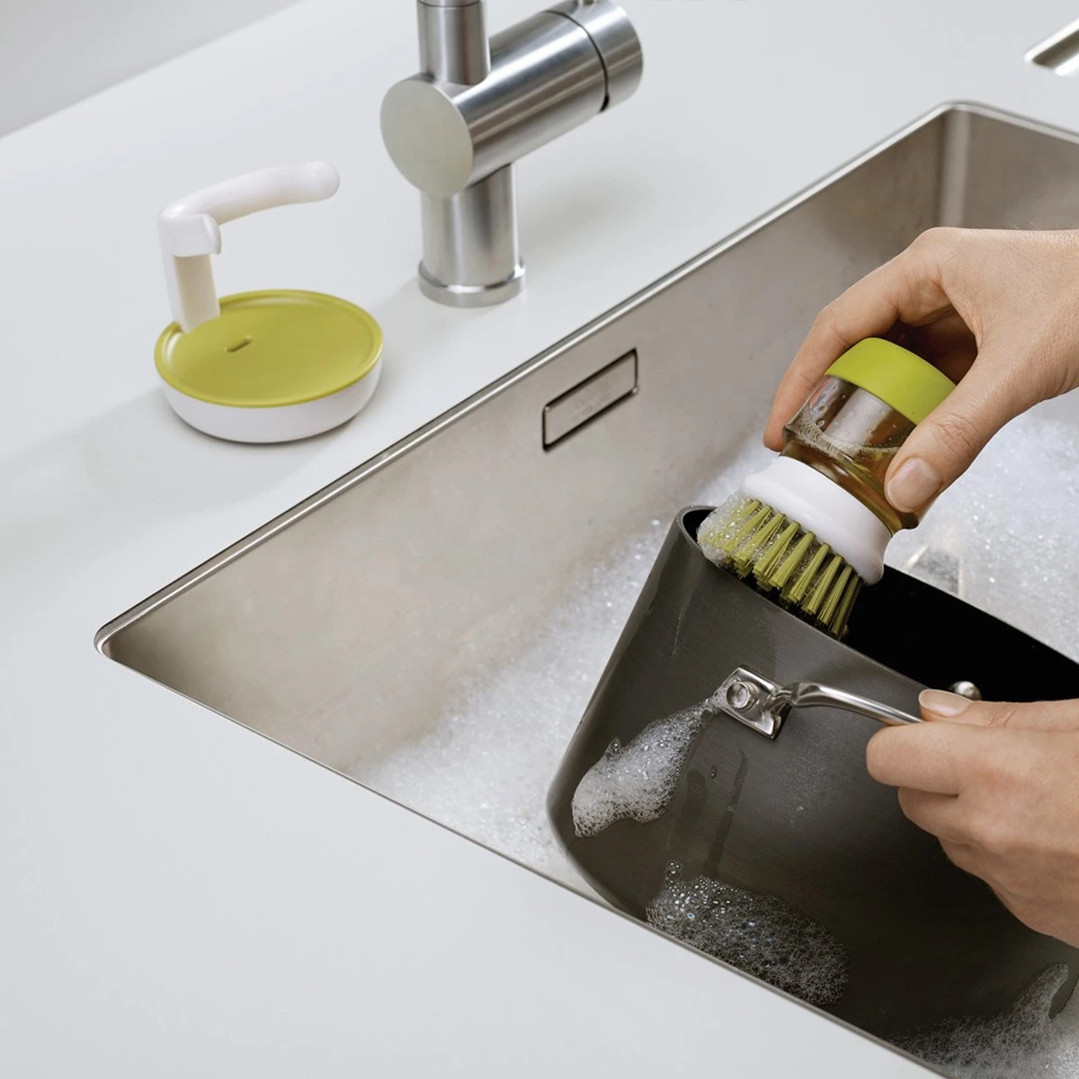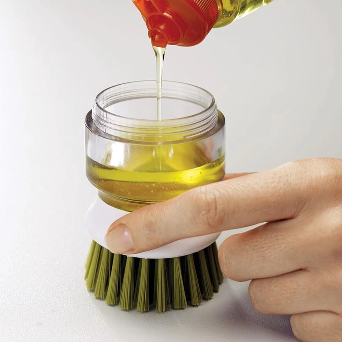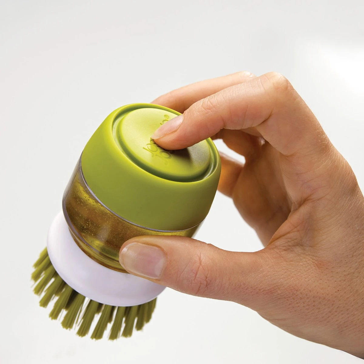 Deze innovatieve Palm Scrub afwasborstel van Joseph Joseph is ideaal voor het reinigen van pannen en servies. De afwasborstel is niet zo maar een afwasborstel, want deze is bevestigd op een handige zeepdispenser die u kunt vullen met afwasmiddel. Met 1 druk op de knop komt het afwasmiddel uit de dispenser via de afwasborstel, waardoor u servies en pannen eenvoudig kunt reinigen. Het afwassen van uw servies in een sopje is dus verleden tijd! Dit werkt niet alleen prettig, maar is ook hygiënisch. U hoeft servies en pannen nu nooit meer te reinigen in water dat al vervuild is. De afwasborstel heeft anti-kras borstelharen, waardoor u deze ook prima kunt gebruiken in pannen met een anti-aanbaklaag. De afwasborstel wordt bovendien geleverd met een handige houder. De houder vangt overtollig water en zeep, afkomstig uit de afwasborstel, eenvoudig op in het reservoir. U kunt de houder eenvoudig uit elkaar halen om het overtollige water en zeep weg te gooien. Daarna kunt u de houder eenvoudig reinigen in de vaatwasmachine. Hierdoor kunt u hygiënisch werken.