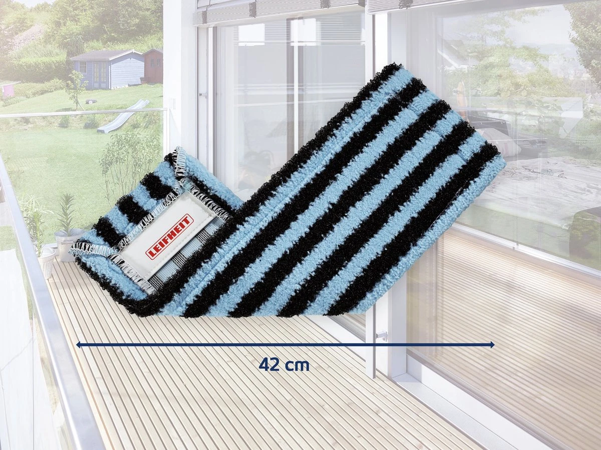 De specialist voor buiten: De strepen van de weerbestendige kunststof borstels verwijderen zelfs het hardnekkigste vuil. Of het nu om terrassen, balkons, buitentrappen of de garage gaat. De daartussen liggende microvezelstrepen nemen het verwijderde vuil op. Special clips maken de eenvoudige bevestiging aan de Leifheit-doekpers Profi mogelijk. Breedte 42 cm. Uitwasbaar op 60°C.