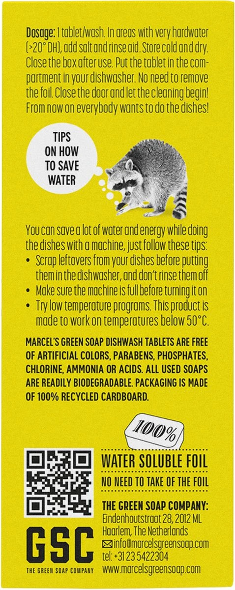 Zoals alle producten van Marcel’s Green Soap, bevatten onze vaatwastabletten geen kleurstoffen, parabenen, fosfaten, chloor, ammonia of zuren. Sterker nog, ze zitten bomvol natuurlijke ingrediënten en zijn minstens 97% biologisch afbreekbaar! De vaatwastabletten zijn verpakt in een oplosbare folie. Op deze manier hoef je niet met je natte handen op zoek naar een schaar om het plastic eraf te halen, en besparen we ook weer een hoop plastic. De folie is gemaakt van maïszetmeel en lost op tijdens het wassen. Je hoeft je dus niet druk te maken over plastic dat achterblijft in de machine of het riool.