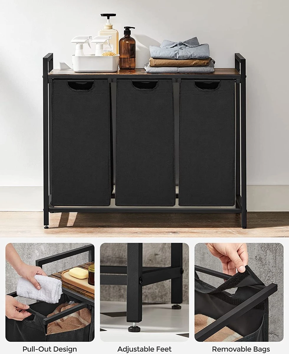 Handige wasmand: 3 tassen, 1 plank – zo veel opbergruimte! Sorteer je wasgoed met de drie stoffen zakken (Totaal 82,5 Liter) en plaats de wasmiddelen en wasverzachters op de plank. Al je opbergbehoeften voor een luchtige wasdag worden verwelkomd door deze wasmand.