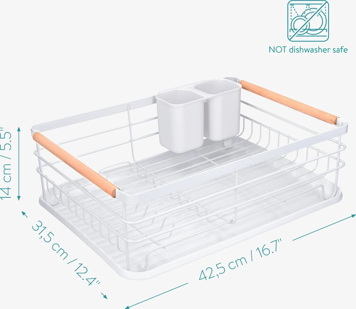 - DETAILS: Je ontvangt een afdruiprek van kunststof, metaal en beukenhout in de afmetingen 42,5 x 31,5 x 14 cm. De losse lekbak is makkelijk leeg te maken. Wordt geleverd inclusief uitneembare bestekhouder.
