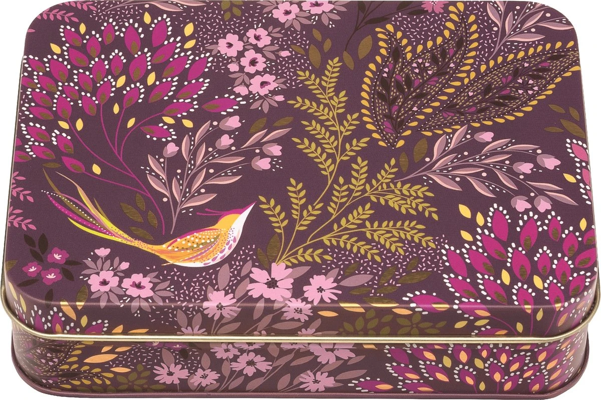 Paars bewaarblik met een sierlijke vogel en blaadjes.. Het bewaarblik is prachtig afgewerkt met gouden details. Mooi bewaarblik van goede kwaliteit. Lengte: 14cm Breedte: 10cm Hoogte: 4cm Voorzichtig afnemen met een vochtige doek, gelijk droogmaken. Niet in water laten weken. Gemaakt van: Blik