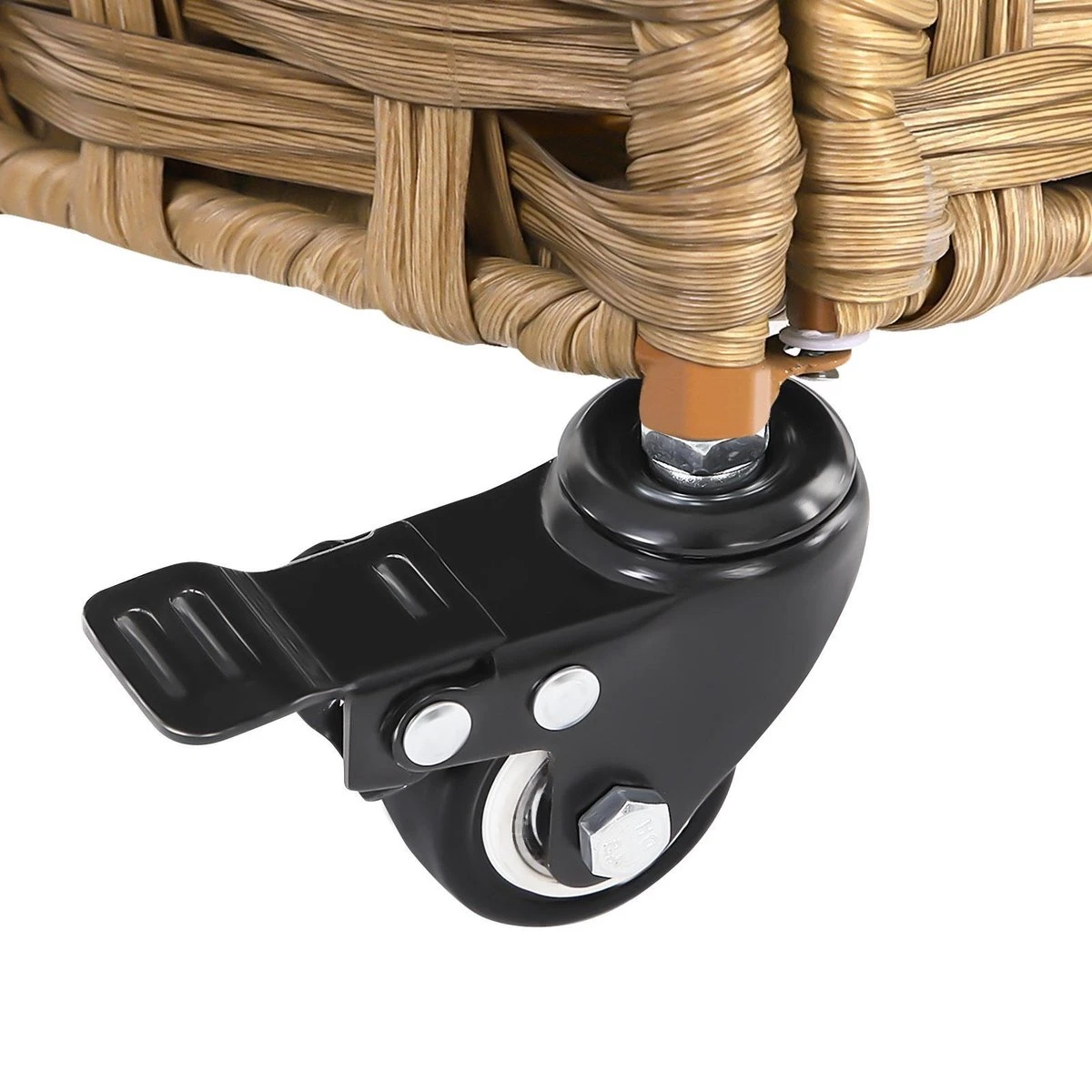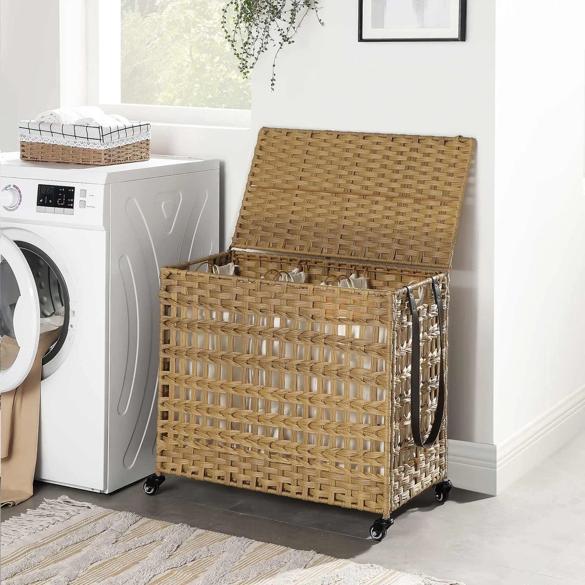 ROLLEN OF TREKKEN? Zoals ze willen. Dankzij de 4 wielen en de stijlvolle synthetisch leren riem kan zelfs een kind deze kist duwen of trekken naar de wasmachine. Met 2 remmen kunt u de waswagen op één plek vergrendelen.