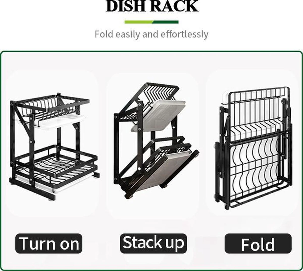 De compacte afdruiprek is gemaakt van hoge kwaliteit, roestvrij staal en antikras materiaal. Frame, antislip en de connectors zorgen voor een solide ondersteuning, zodat de rek soepel beweegt en stabiel staat. - GEEN INSTALLATIE NODIG