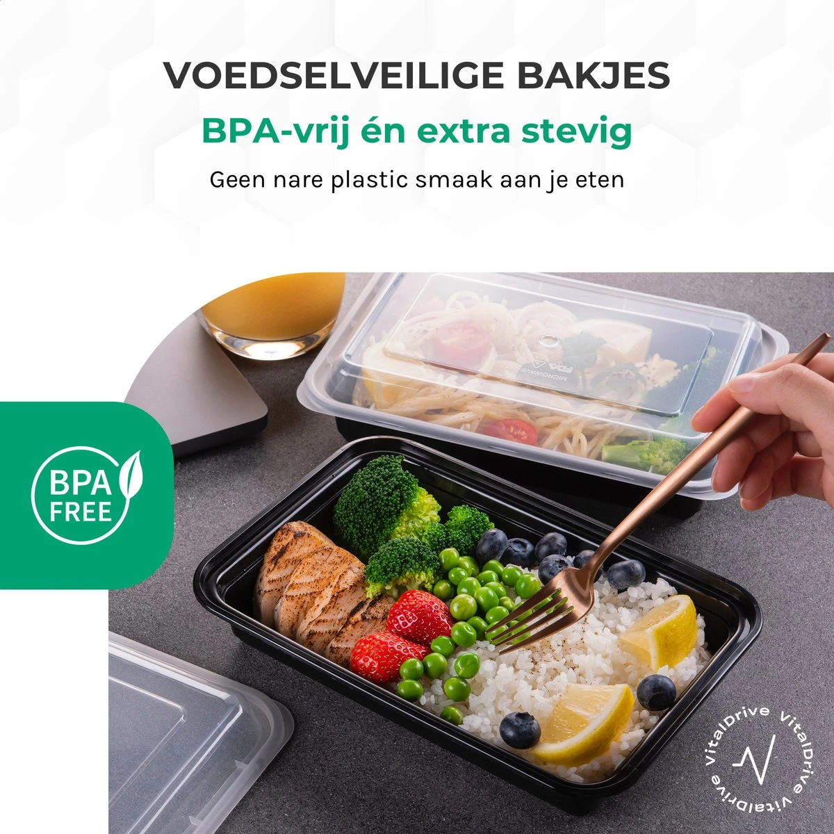 De VitalDrive voedsel containers voldoen aan de striktste veiligheidsnormen en zijn 100% BPA vrij. Wij denken aan jouw gezondheid en met onze bakjes eet je stress vrij elke meal prep.